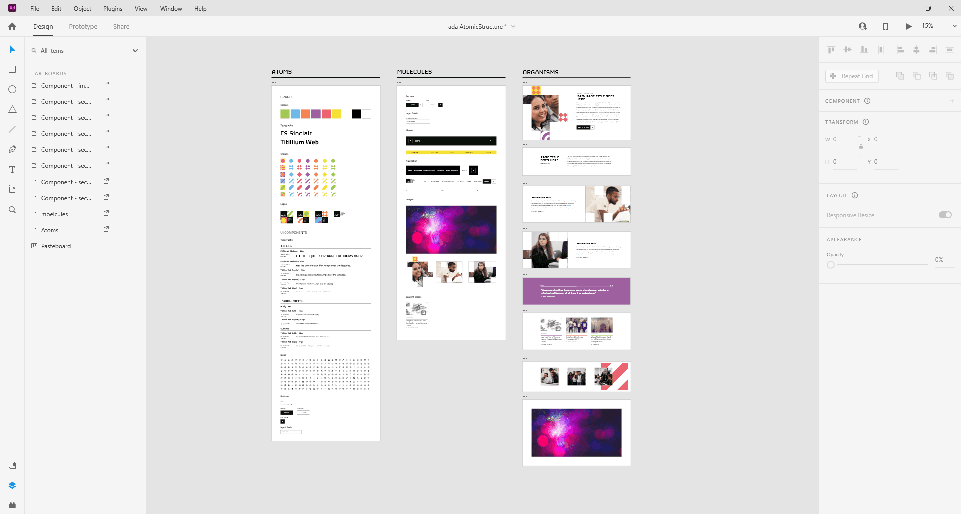 Atomic design structure and component library - basic elements are the buidling blocks for complete portfolio pages